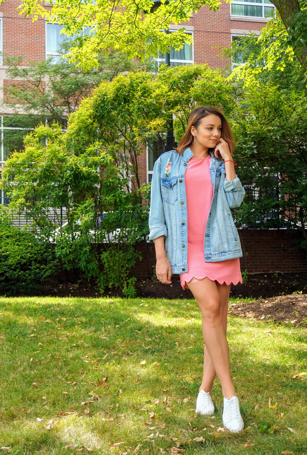 dress with jean jacket and sneakers